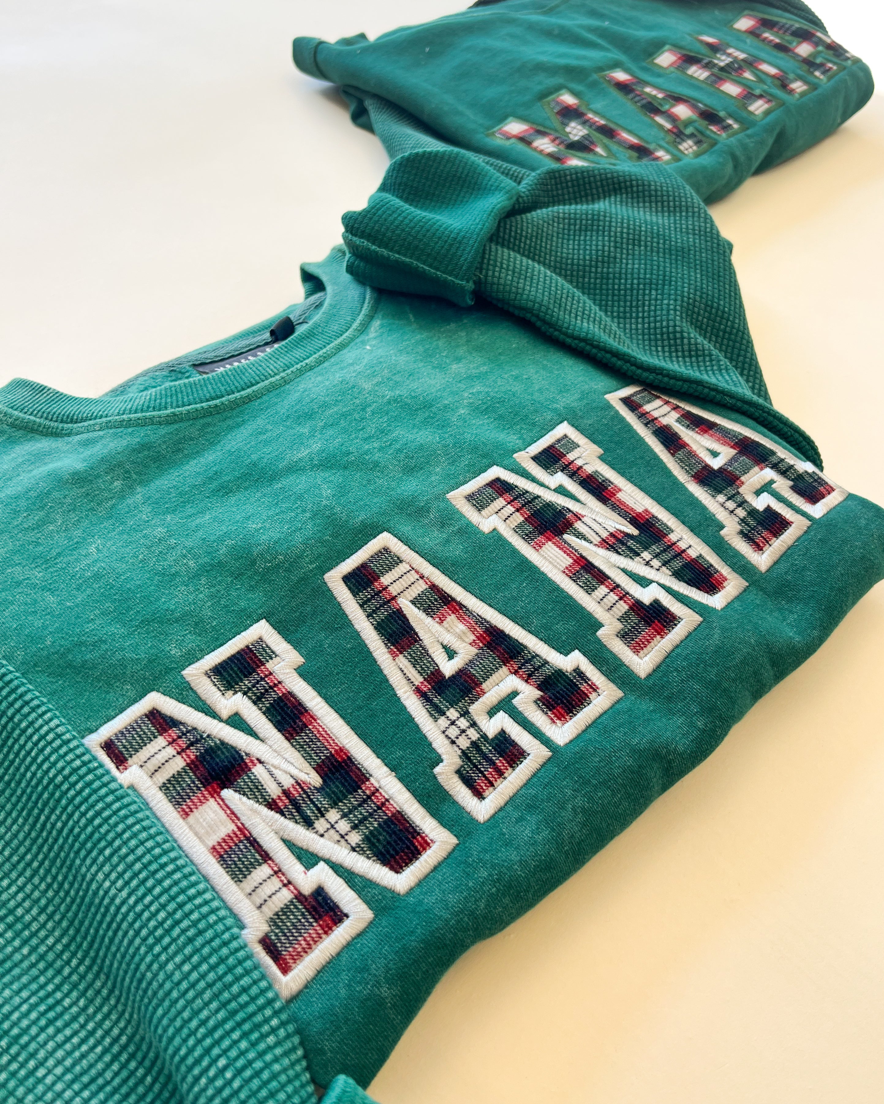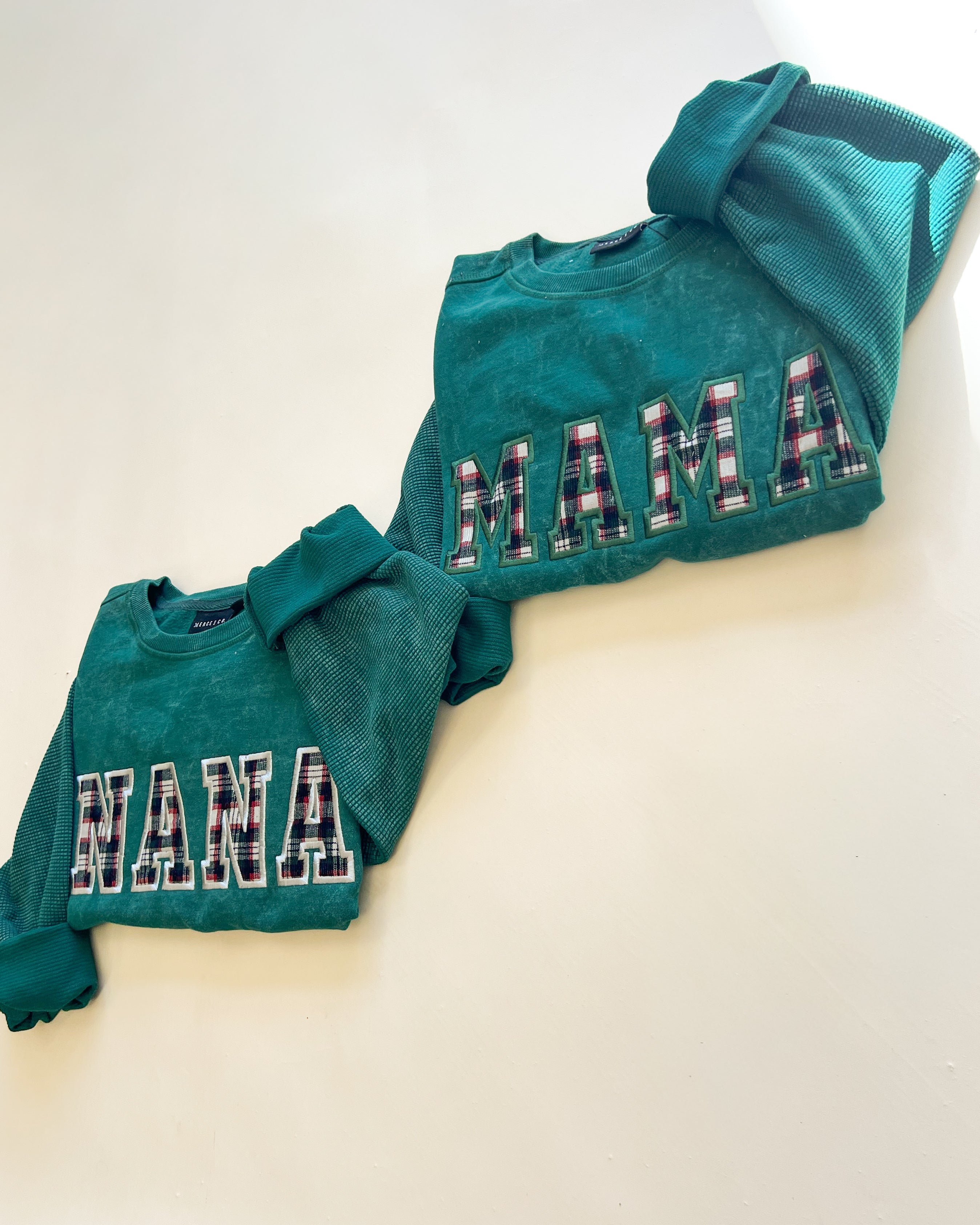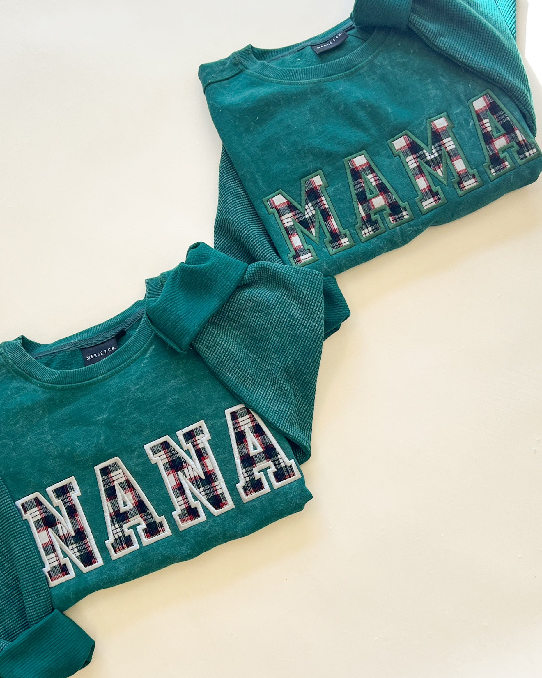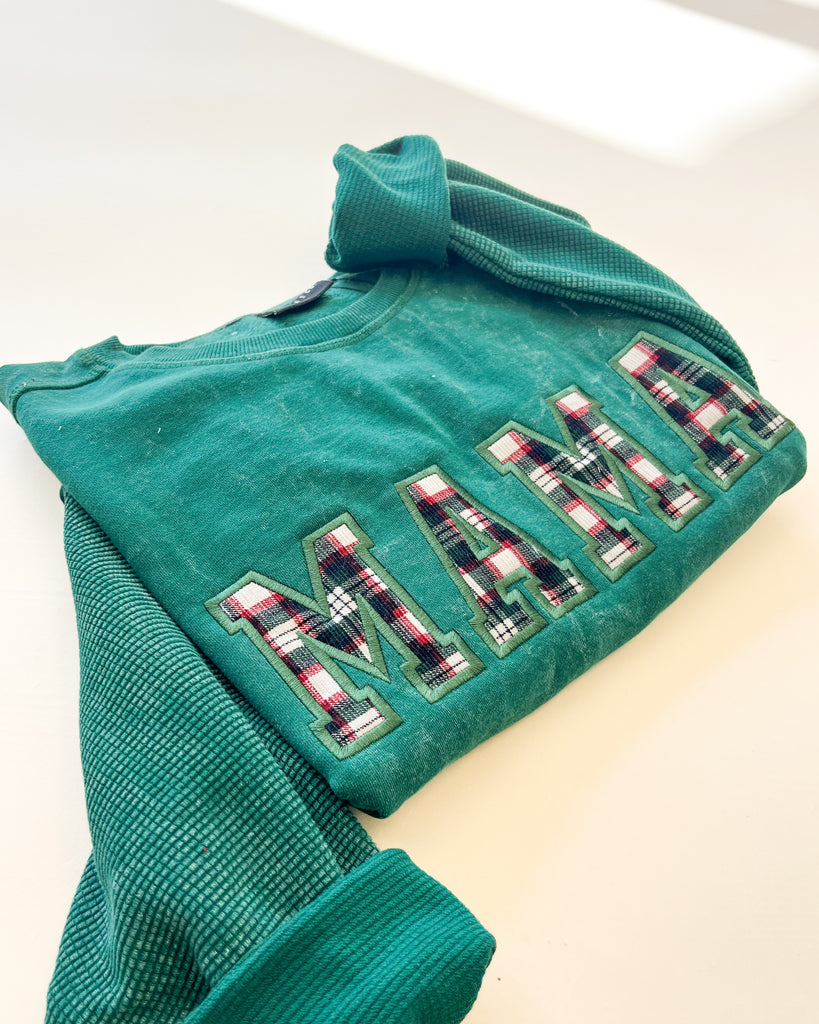 Custom Festive Plaid Applique Waffle Sleeve Crewneck - Pine