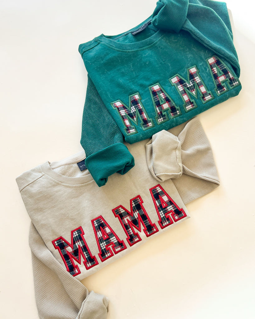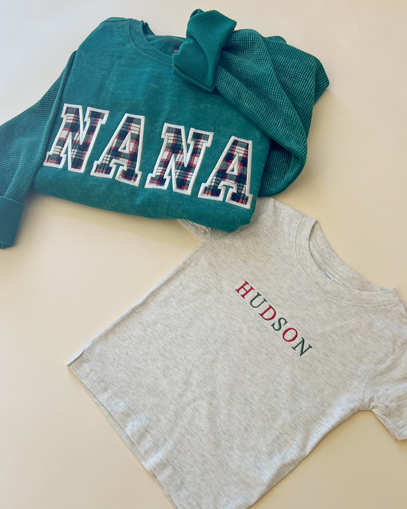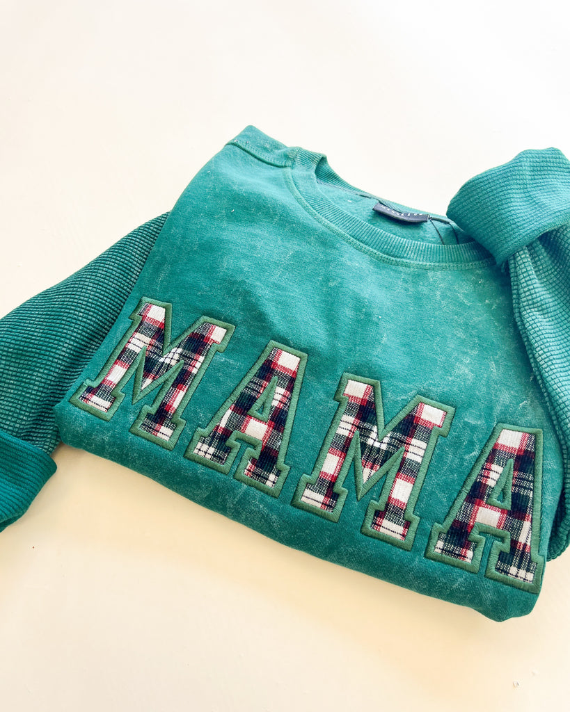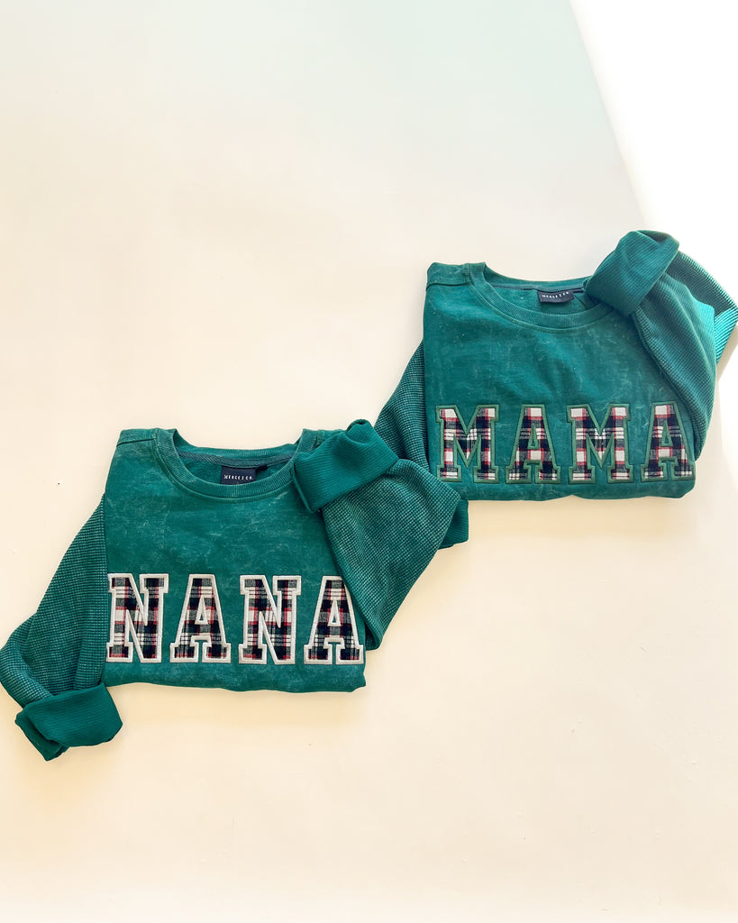 Custom Festive Plaid Applique Waffle Sleeve Crewneck - Pine