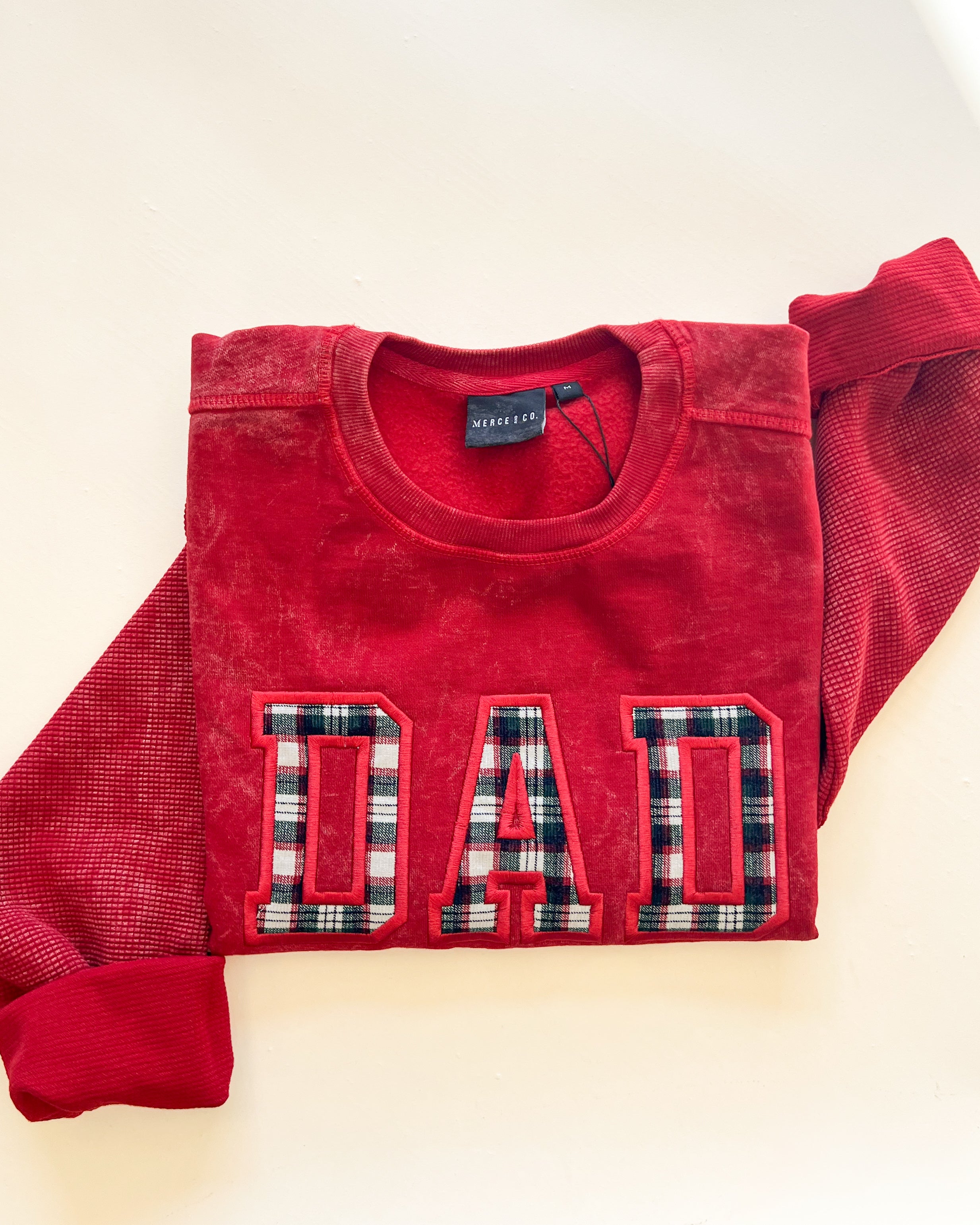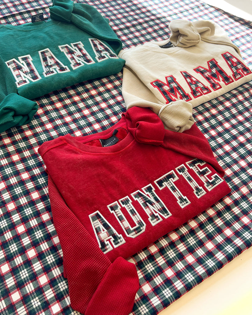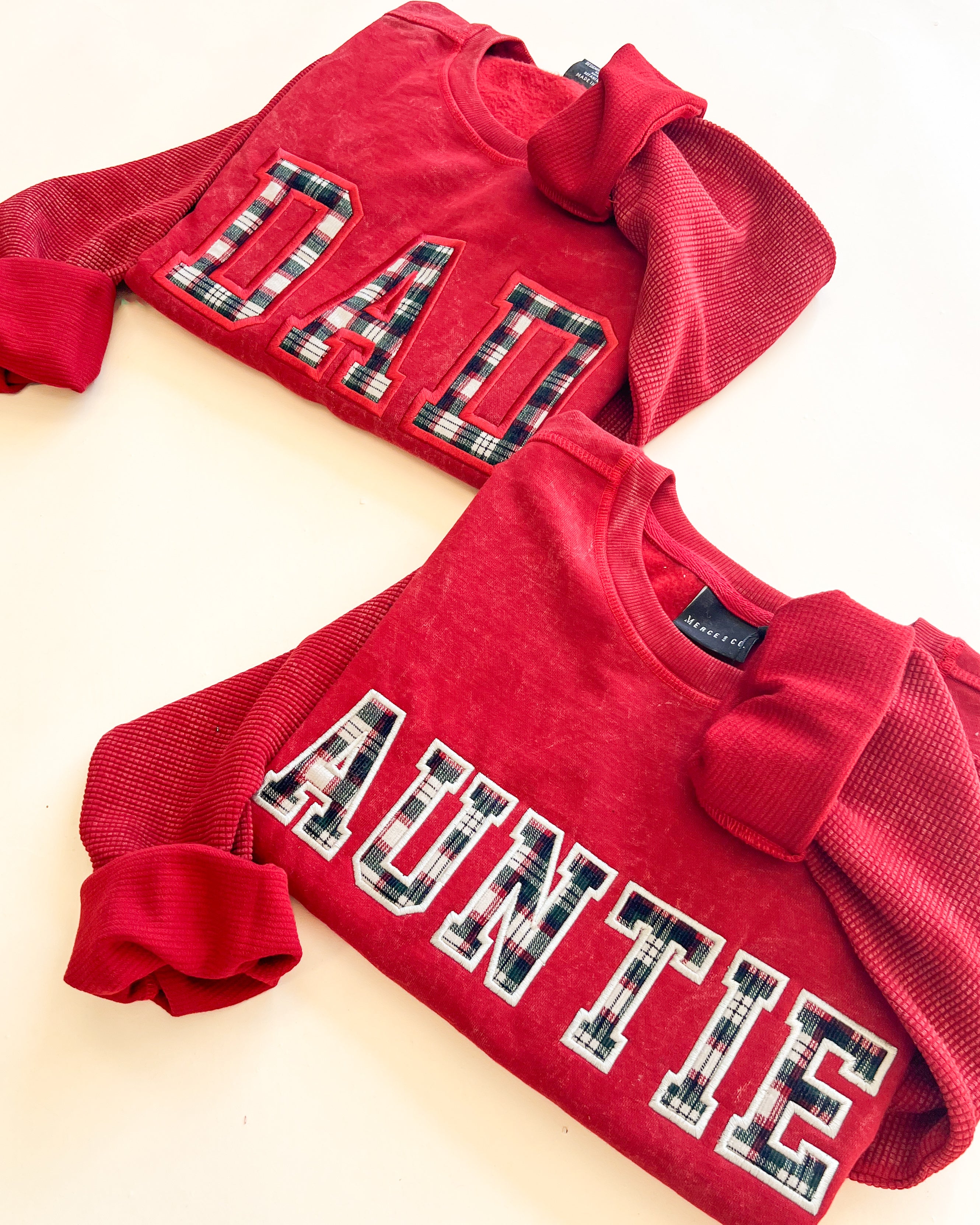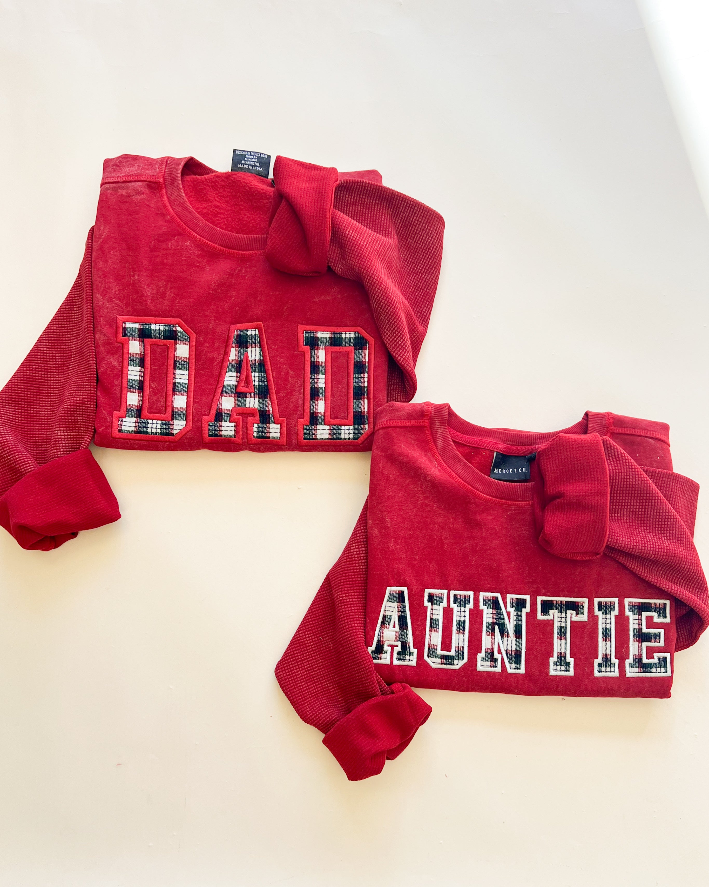 Custom Festive Plaid Applique Waffle Sleeve Crewneck - Ruby