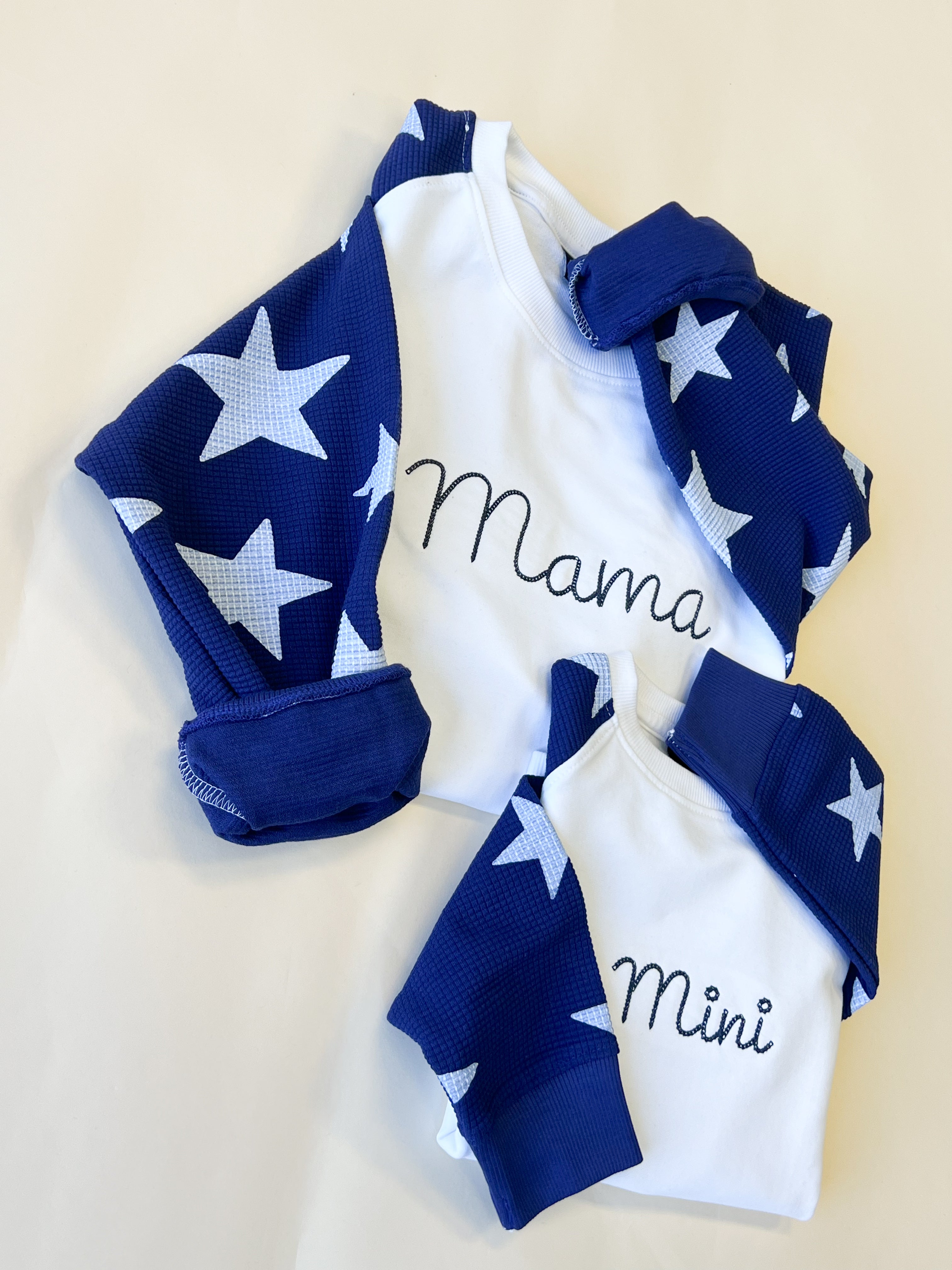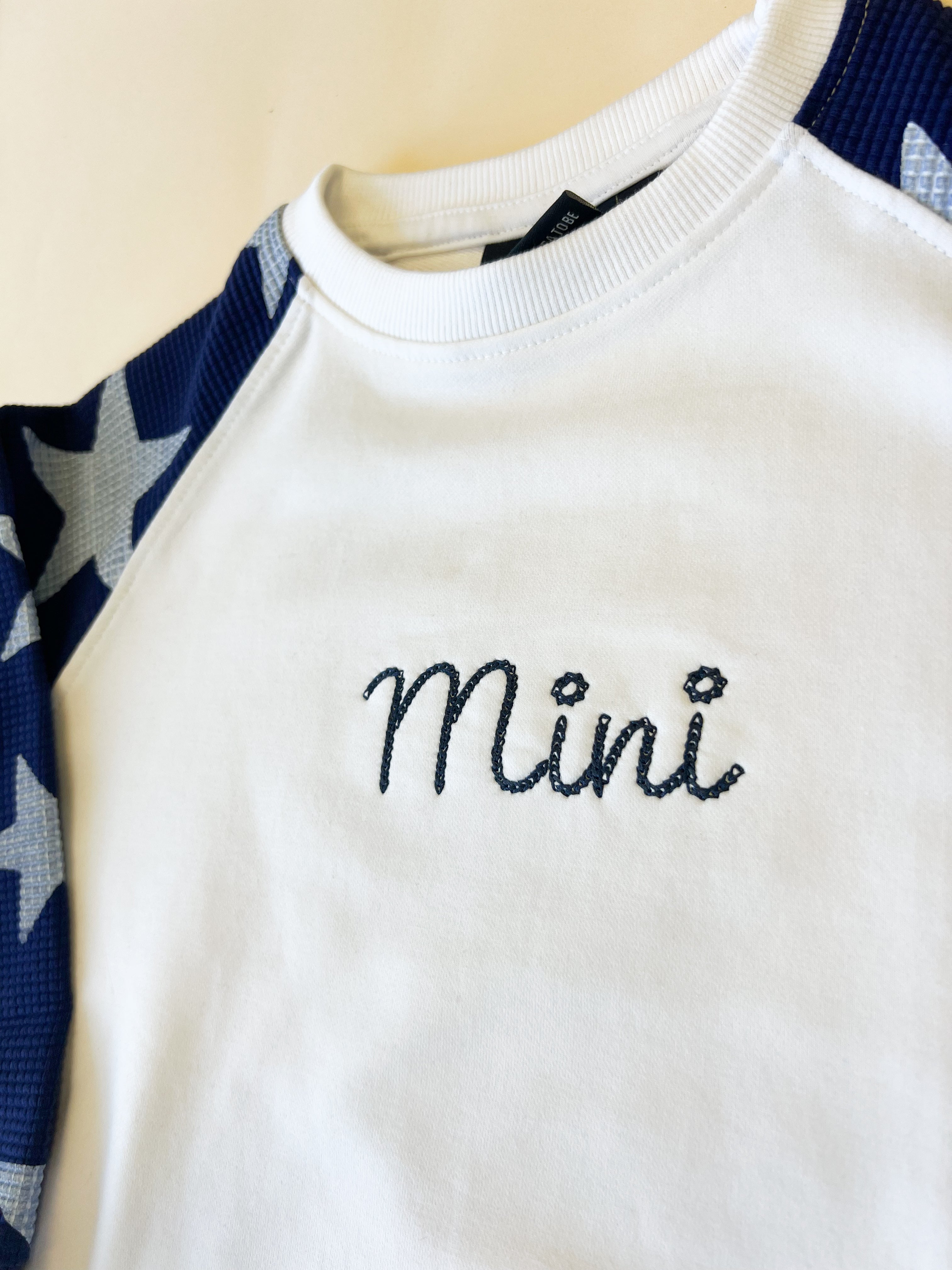 Custom name embroidered in navy thread.