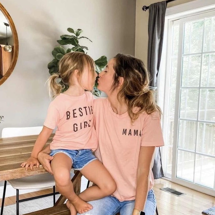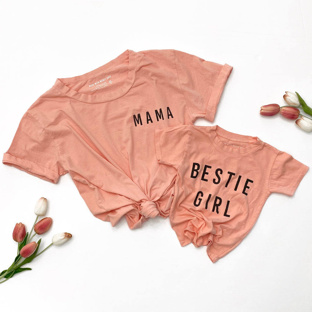 •ITEM: Child's Tee in pale coral, with "BESTIE GIRL" printed in black ink. Very lightweight material. 100% Cotton.